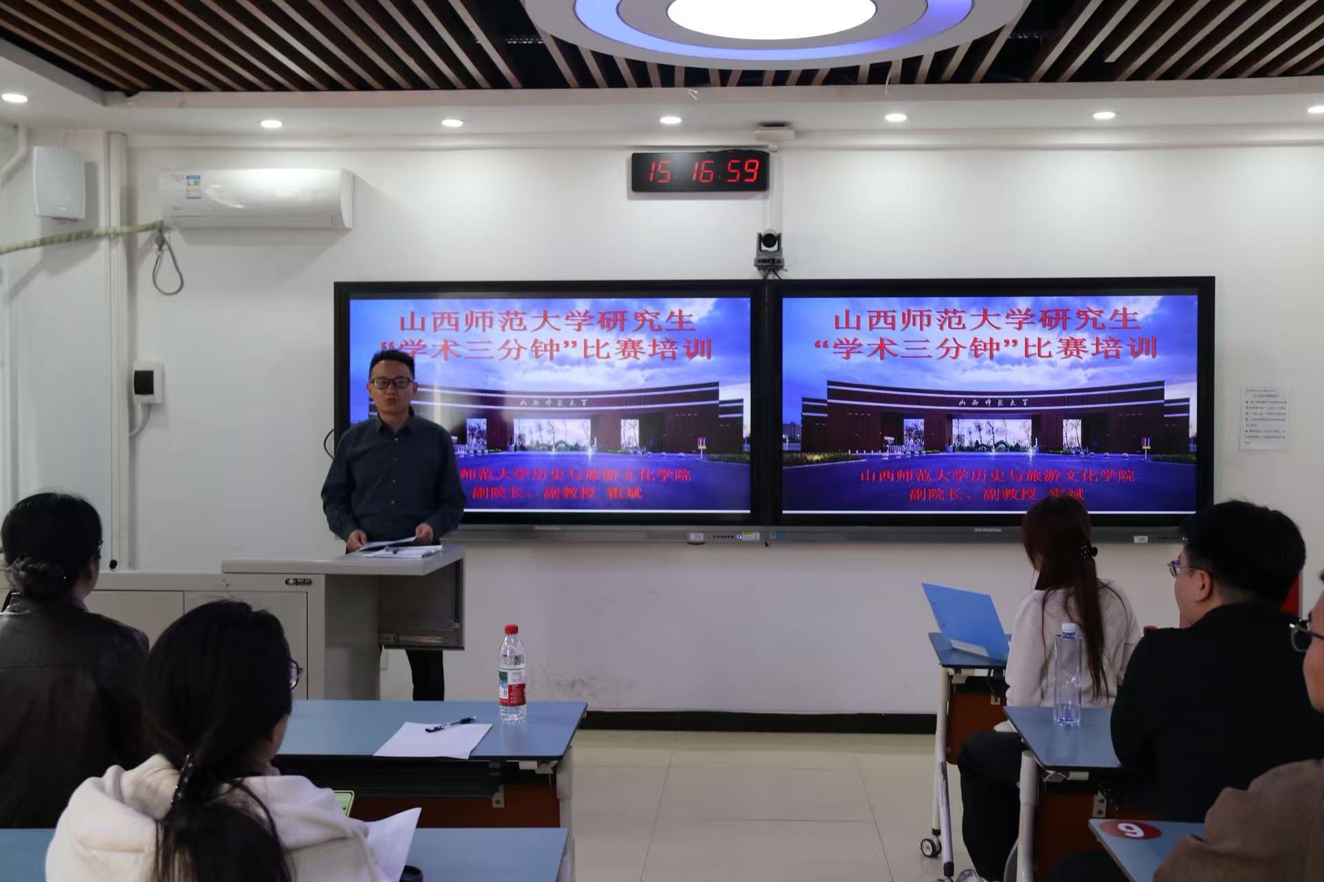 为帮助首届研究生“学术三分钟”演讲比赛参赛选手精准把握赛事要点、优化演讲内容与形式,4月14日下午,研究生院在6号教学楼6302教室举办赛前培训活动。特邀历史与旅游文化学院副院长霍斌为选手们进行赛前指导。同时,山西大学第五届“学术五分钟”演讲比赛获奖选手代表乔一丹、要银雪也应邀参加本次培训。