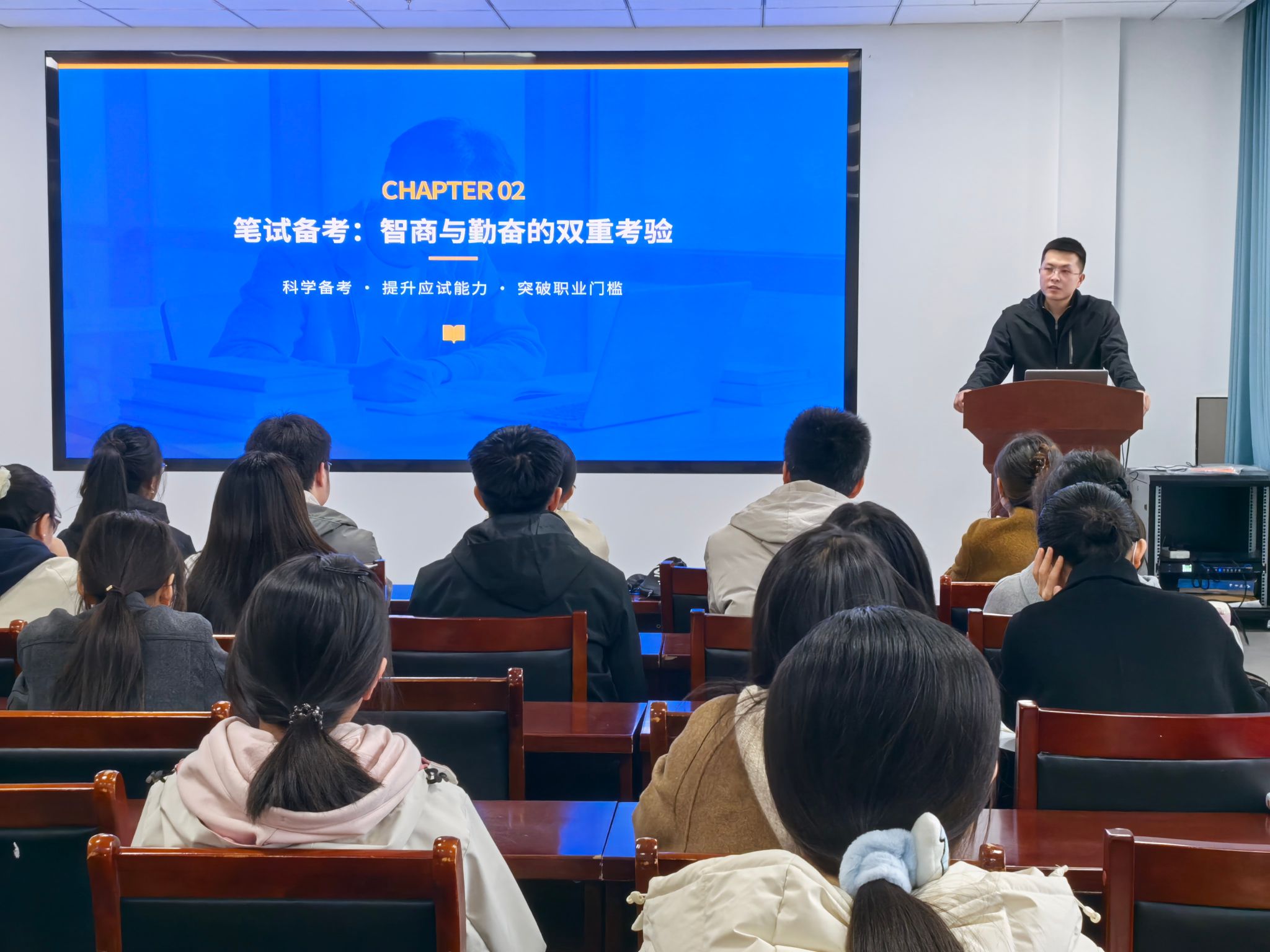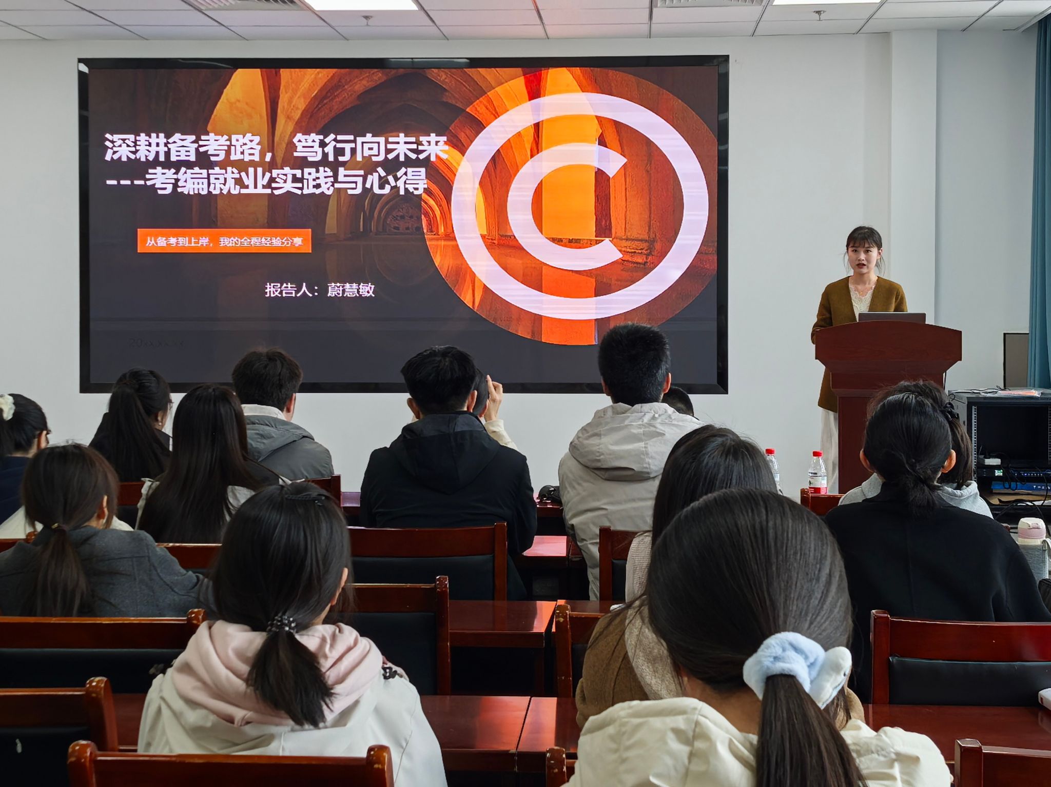 会上,两位校友分别围绕教师考编与公务员考试,从政策解读、职业规划、备考策略、面试技巧、心理调适等方面进行了细致深入的分享。蔚慧敏聚焦教师编备考,从笔试与面试试讲两个维度展开讲解。她建议同学们在备考阶段紧扣考试内容精准复习,通过制定备考时间表、构建知识体系、强化真题演练、注重错题复盘夯实基础,同时做好心态调节,以积极状态应对求职考试。杨光宇以“以选为志,以考为径”为主题,系统讲解了公务员考试全流程的备考要点。他首先梳理了体制内岗位分类及研究生考公定级薪资特点,提醒大家仔细研读招考公告,并结合自身求职与工作经历,从笔试、面试、岗位选择、职业规划等方面提出了诸多宝贵建议。