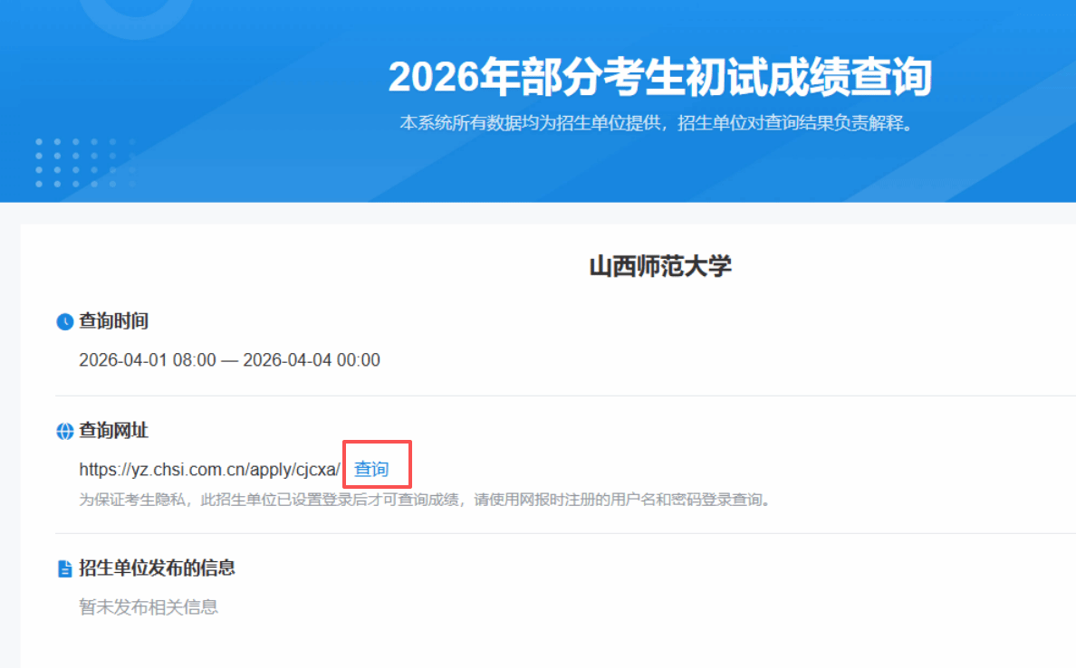我校2026年硕士研究生第一志愿考生已经复试完毕,复试成绩可通过研招网进行查询。